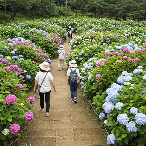 - 특징: 자연 그대로의 야생 수국 감상 가능